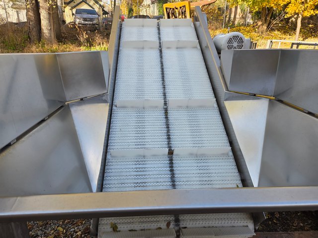 Bin Dumper Hopper with discharge conveyor. Last used to receive produce from Bin Dumper #8532.